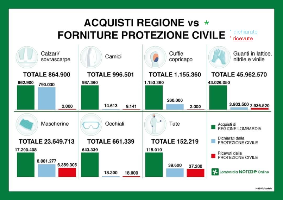 Poi le mascherine sulle quali basta un dato: Regione ne ha fatte produrre in Lombardia o acquistate 17 milioni, la Protezione Civile che per legge aveva il compito di garantire la fornitura, solo 6 milioni, cioè un numero insufficiente anche solo per gli ospedali.